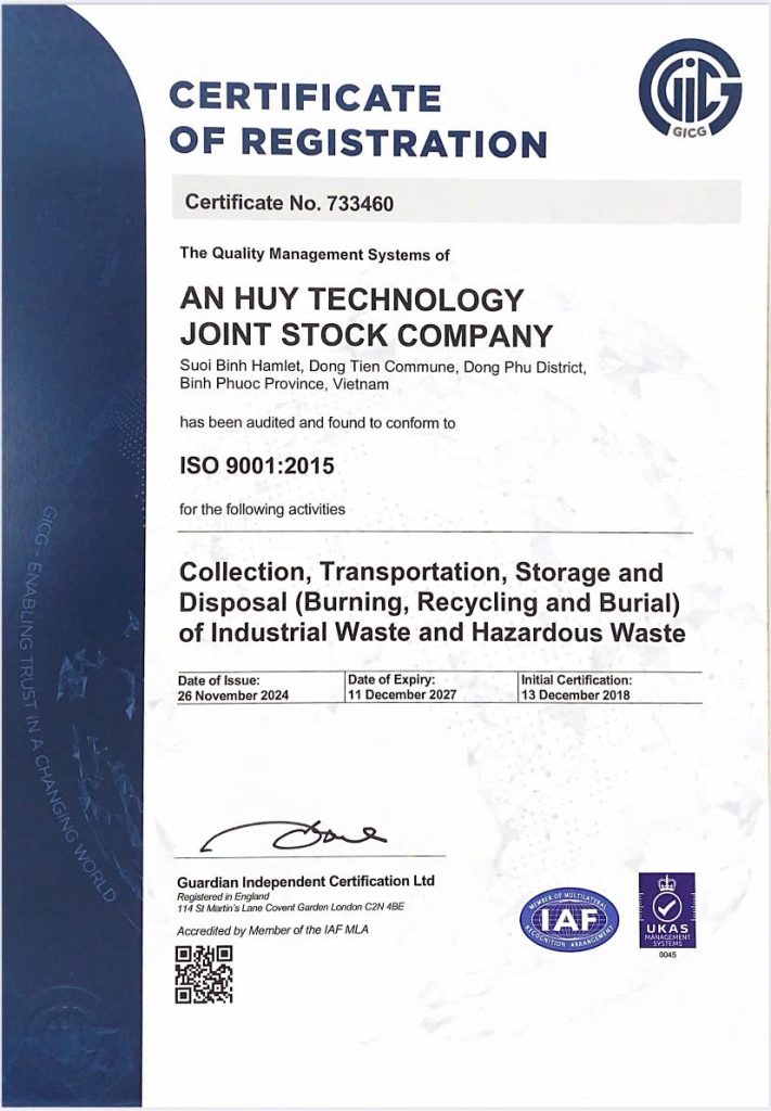 Hiện tại Công ty quản lý các hoạt động sản xuất kinh doanh theo các tiêu chuẩn ISO 9001, ISO 14001, ISO 45001 và luôn tuân thủ theo các quy định của pháp luật cũng như những cam kết trong bộ hồ sơ đăng ký xử lý chất thải nguy hại.